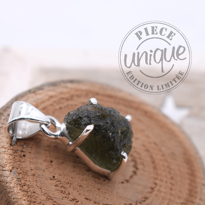 La moldavita es un mineral vítreo de tonos verde oliva a verde oscuro. Se formó hace alrededor de 15 millones de años por el impacto de un meteorito. Resultó de una vitrificación rápida por enfriamento durante la proyección en el espacio. Forma parte de la familia de las tectitas. Su composición química es un dióxido de silicio SiO2 con impurezas de potasio, calcio, magnesio, aluminio, sodio, hierro, titanio, etc.