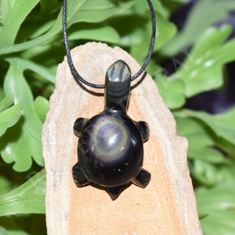 Bello colgante en forma de Tortuga tallado en Obsidiana Arco Iris de México.