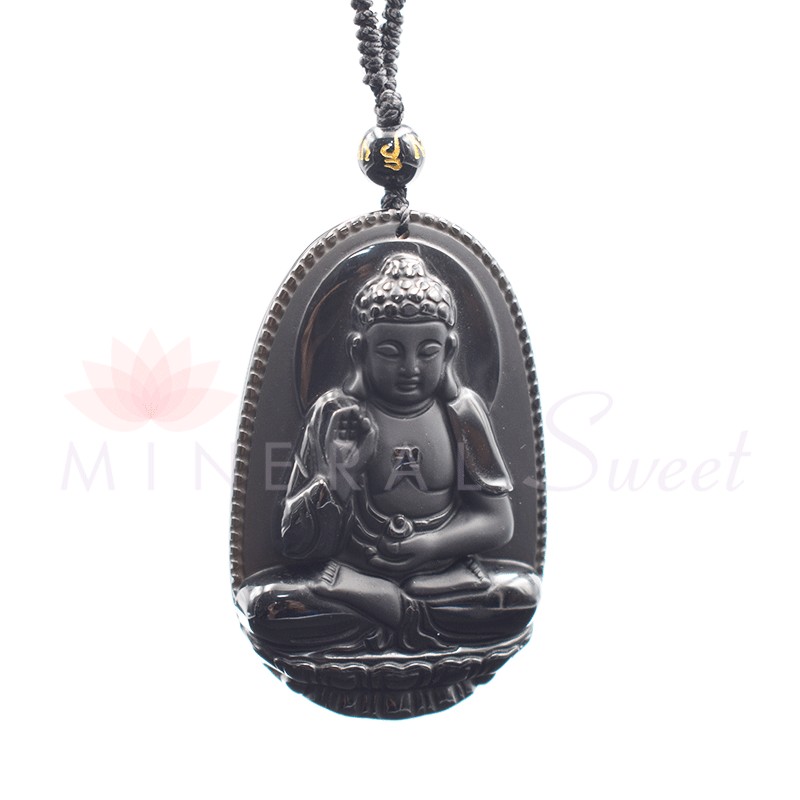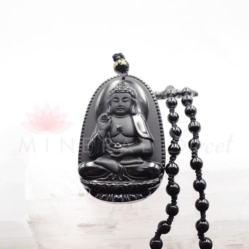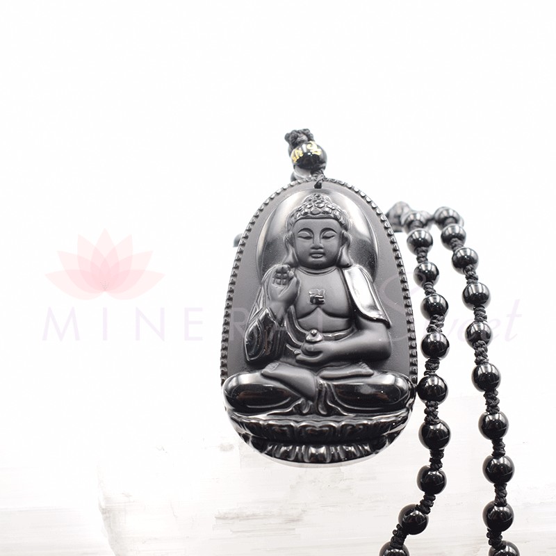 Collar en Obsidiana negra, con un Buda grabado en el medallón.