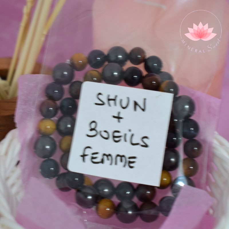 Bonita pulsera para Mujer que combina perlas de Shungit con perlas de Ojo de Halcón, Ojo de Tigre y Ojo de Buey.