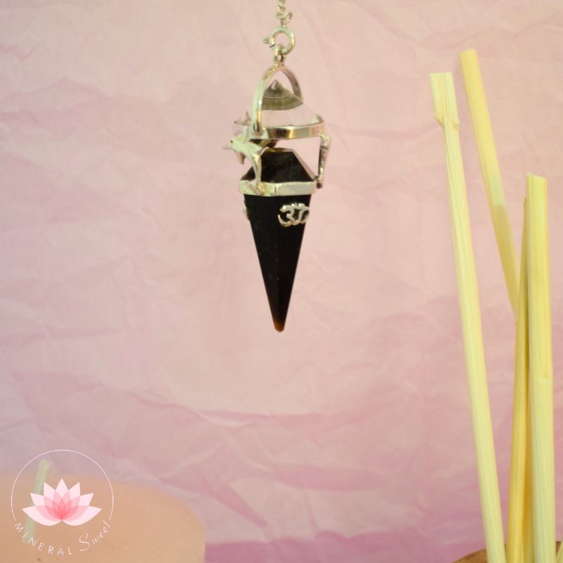 Péndulo de Ojo de tigre con un cono de cristal en su parte superior, todo ell montado en plata.