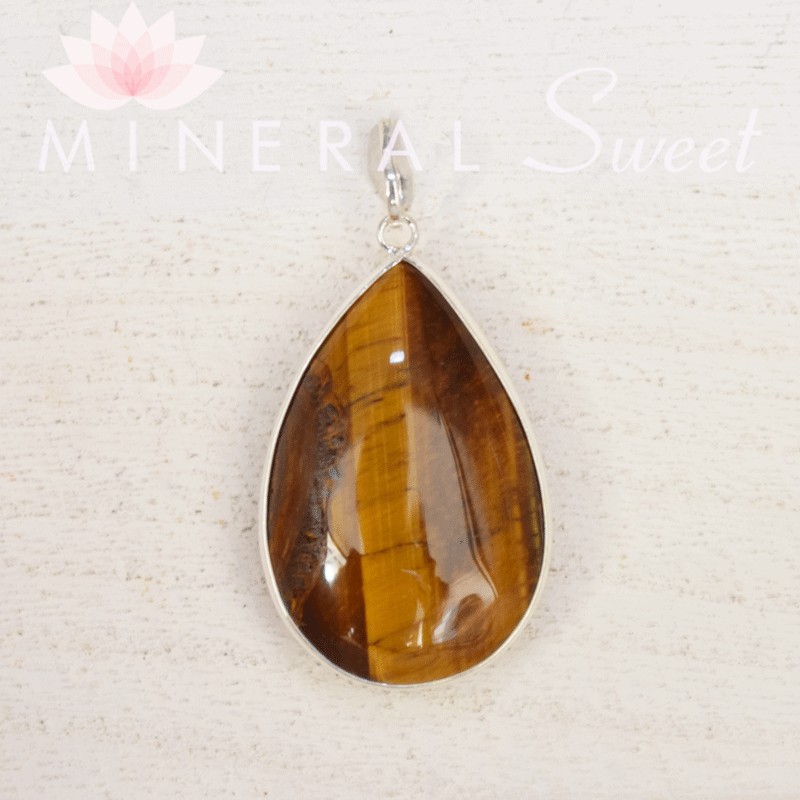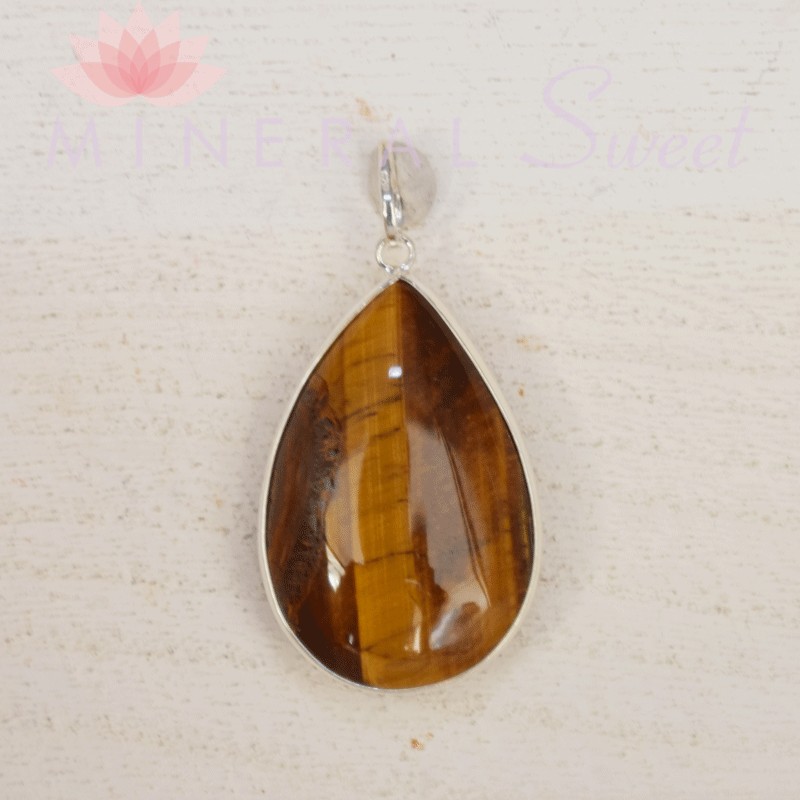 Bello colgante en Ojo de Tigre, tallado en forma de gota y montado en plata.