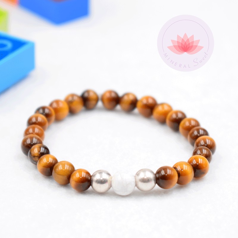 Bonita pulsera para niño en Ojo de tigre y Howlita con piezas de metal color plata.