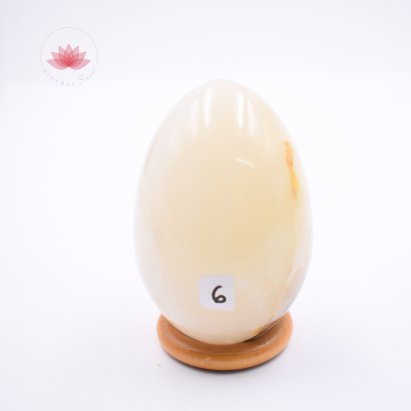 Bello huevo de Ónix en tonalidades verdes. Se envía con su soporte, un aro de bambú.