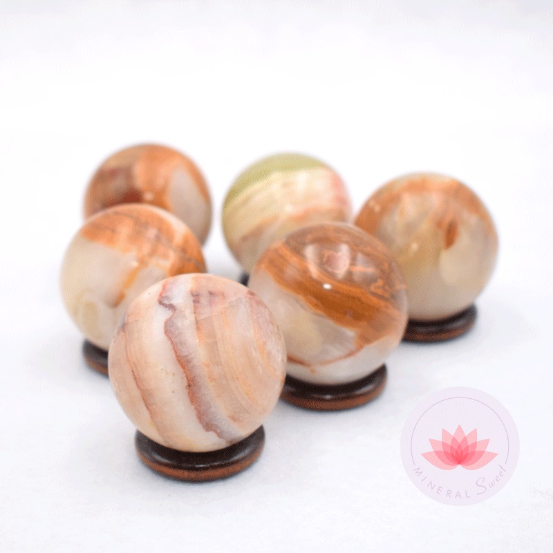 Pequeñas esferas de Ónix en tonalidades verdes y tierra, vendidas por unidades con su soporte, un aro de bambú.