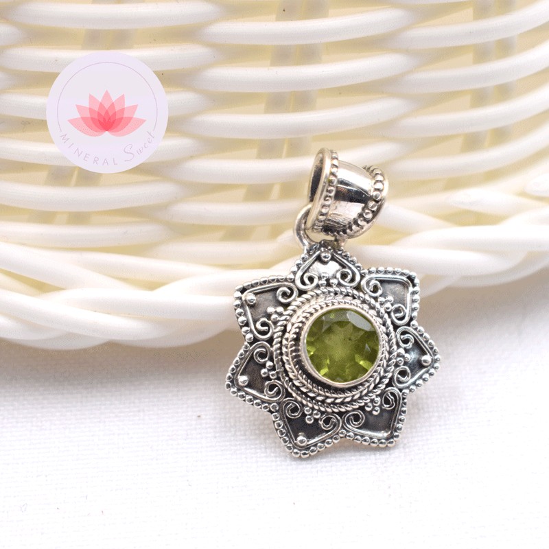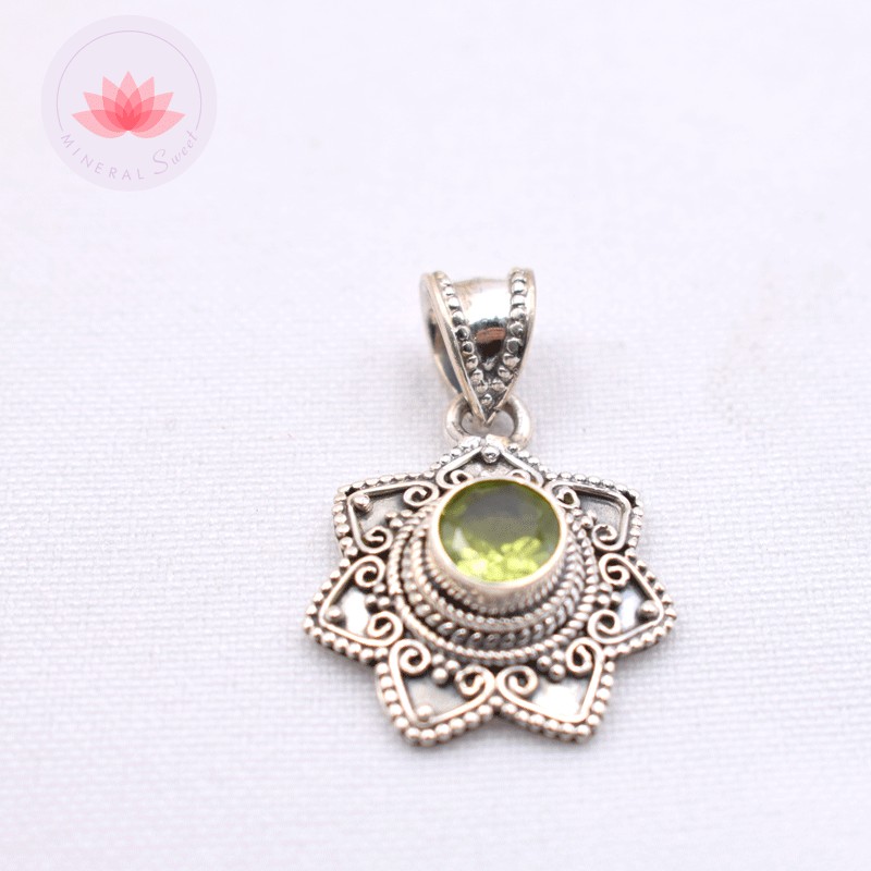 Bonito colgante en plata en forma de flor con un centro formado por una gema de Peridoto.