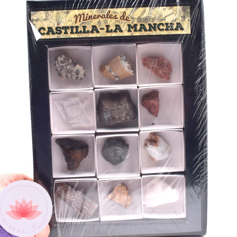 Cajita con 12 minerales que se hallan en Castilla-La Mancha.