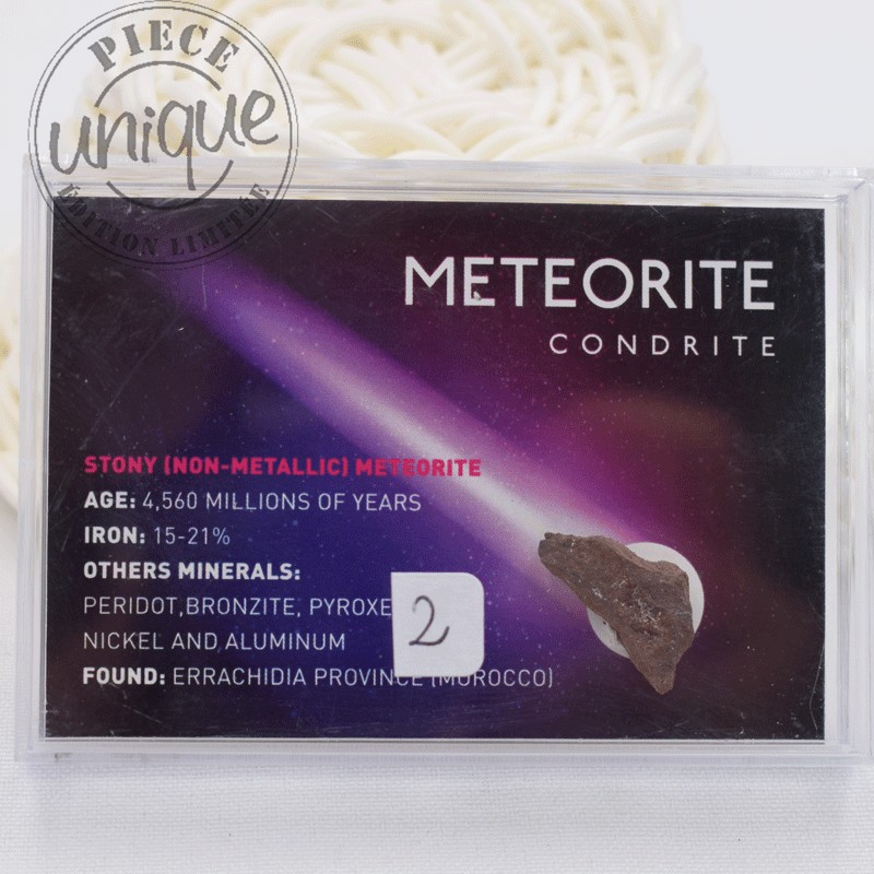 Fragmento de meteorito Condrita, con su cajita de colección y tarjeta de características.