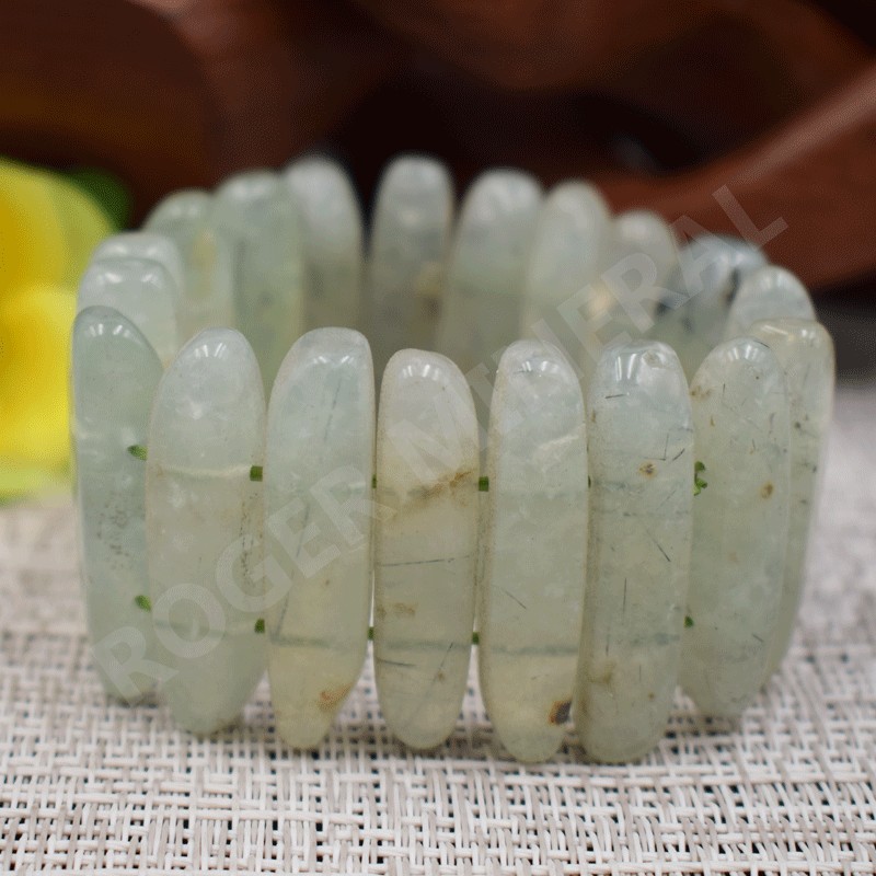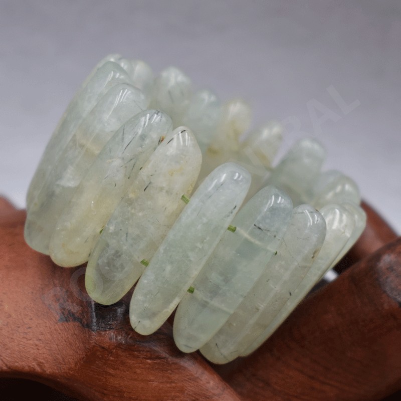 Bella pulsera de Prehnita, perlas talladas en forma de lamas.