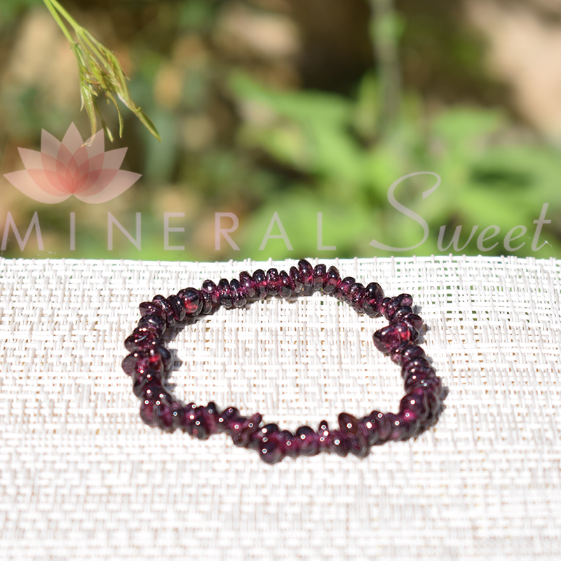 Es una piedra del primer y segundo chakras. No se puede alzar la cabeza al cielo sin, primero, haber plantado los pies sobre la Tierra con fuerza y firmeza; hay que conocer a fondo las fuerzas del primer chakra. El granate incita a mejorar, da coraje, voluntad, sentido de la justicia. Es considerada como piedra del mérito, del reconocimiento, del amor profundo.