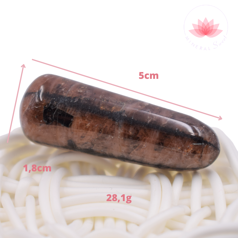 Esta piedra nos encuadra, nos reencuadra, evita la dispersión; por su color oscuro, da un sentimiento de protección, de afirmación de si mismo, evitando de este modo los miedos, la culpabilidad, los bloqueos que la persona se autoinflige. Favorece el sentido de las realidades y la sobriedad.