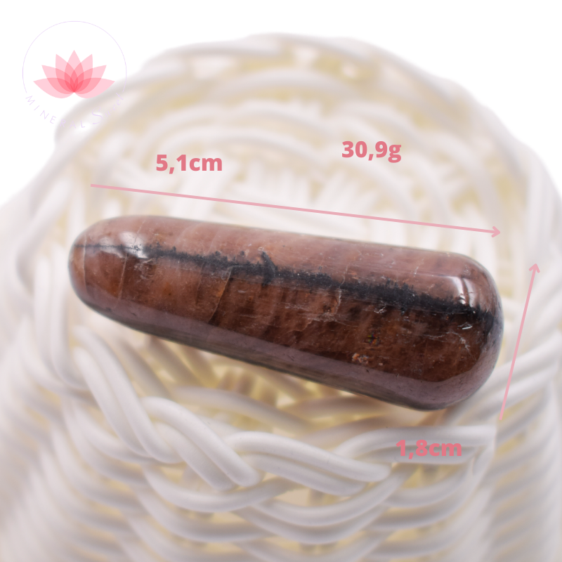 Esta piedra nos encuadra, nos reencuadra, evita la dispersión; por su color oscuro, da un sentimiento de protección, de afirmación de si mismo, evitando de este modo los miedos, la culpabilidad, los bloqueos que la persona se autoinflige. Favorece el sentido de las realidades y la sobriedad.