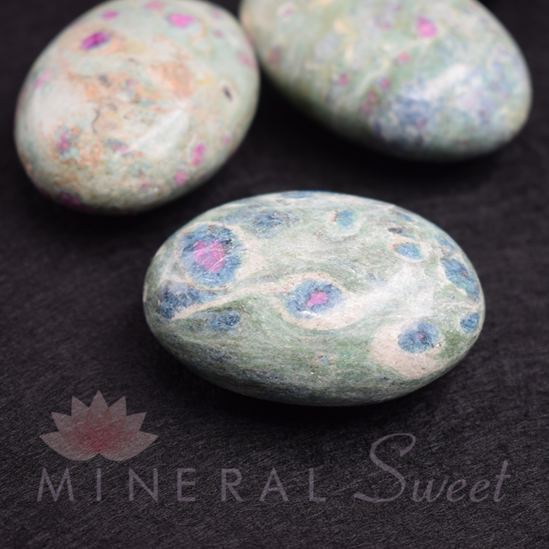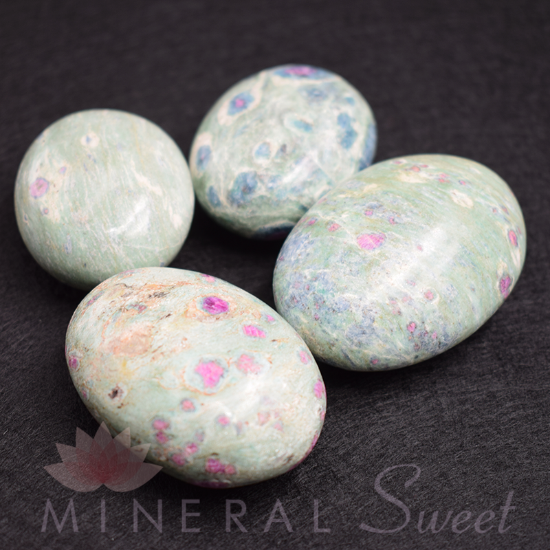 Piedras pulidas de masaje en Rubí sobre Zoisita.