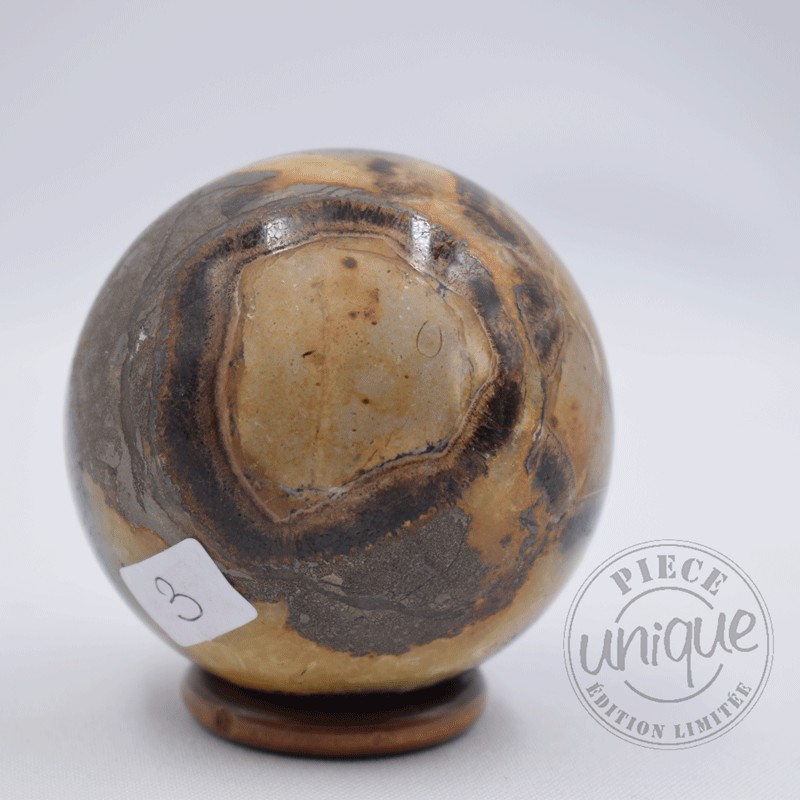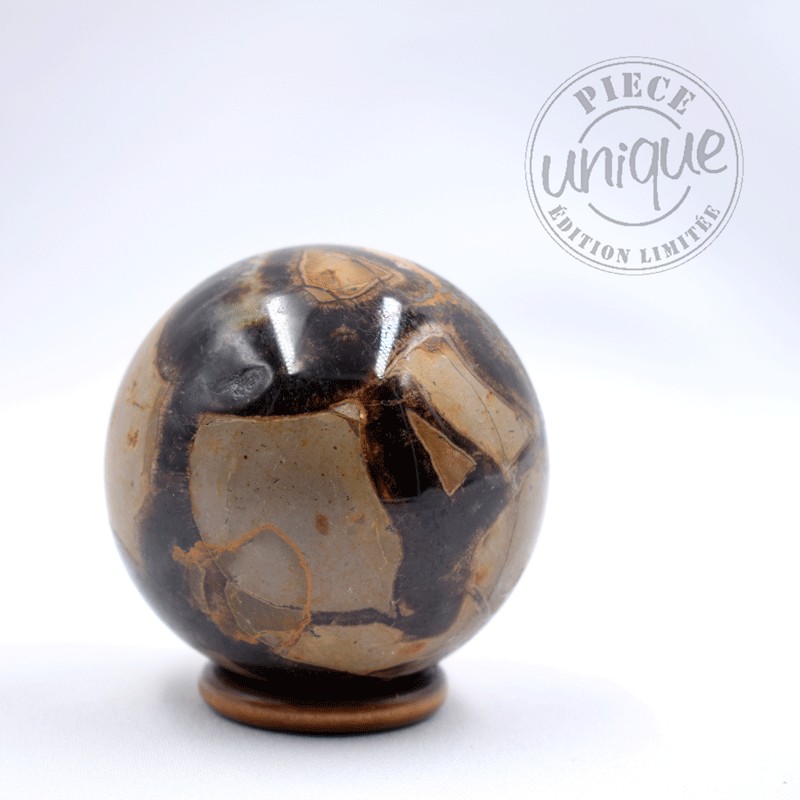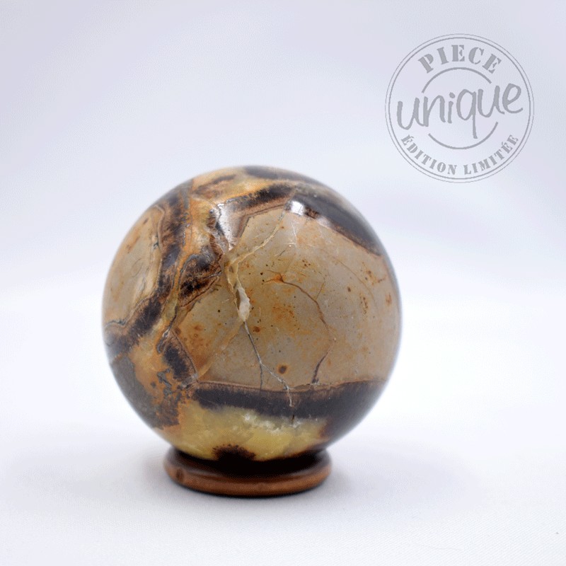 Bonita esfera de Septaria de Madagascar. Se envía con su soporte, un aro de bambú.
