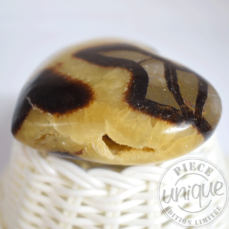 La septaria es una roca sedimentaria llamada marga, mezcla de caliza y arcilla, de composición química (CaCO3), y de calcita amarilla, de composición química CaCO3.