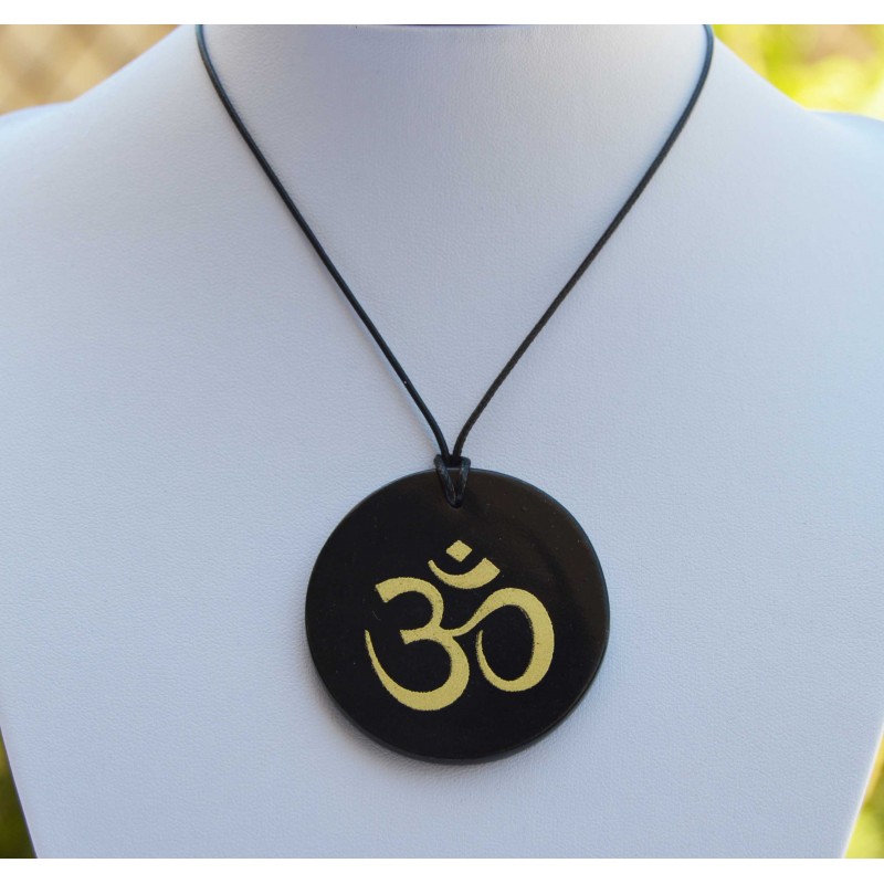 Colgante de Shungit con el símbolo OM grabado en dorado.