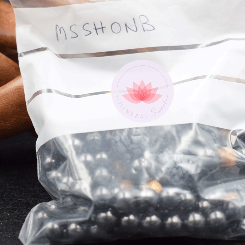 Las perlas de 8mm. Perla central 12mm y 2 perlas de Shungit en 9mm
