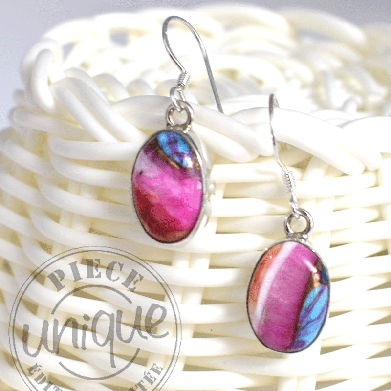 Bonitos pendientes en forma oval de Turquesa cobre montada en plata.