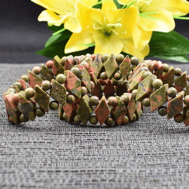 Elegante pulsera de Unakita, perlas talladas en rombo y perlas redondas.