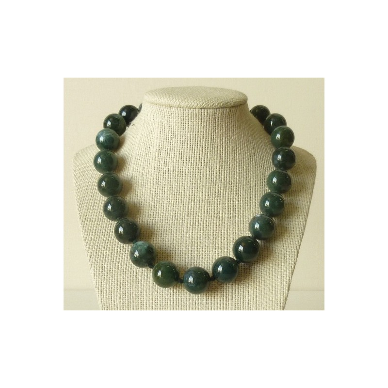 Très beau collier en Agate mousse, variété de Quartz vert, les perles rondes de 16mm sont magnifiques et nous pouvons à cette taille apprécier toute la richesse des variations des couleurs naturelles dans la pierre.