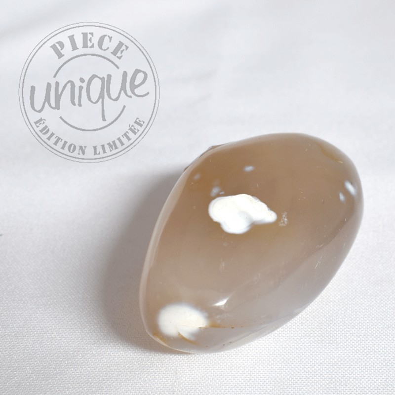 L'Agate est une variété de Calcédoine, dont la composition chimique est un dioxyde de silicium (SiO2) faisant partie de la famille des Quartz.