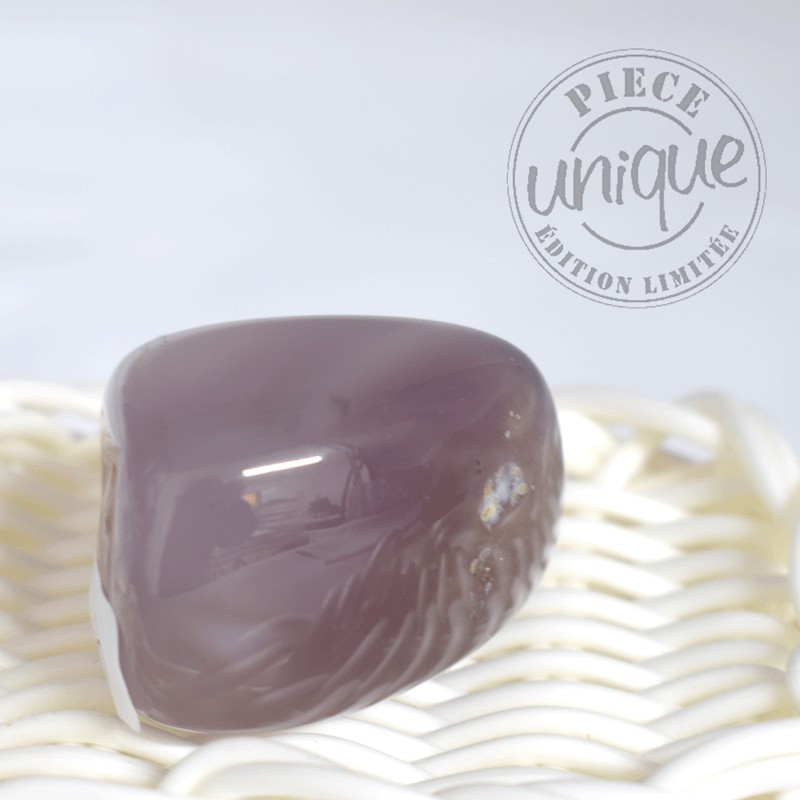 L'Agate est une variété de Calcédoine, dont la composition chimique est un dioxyde de silicium (SiO2) faisant partie de la famille des Quartz.