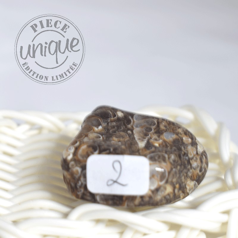 L'Agate est une variété de Calcédoine, dont la composition chimique est un dioxyde de silicium (SiO2) faisant partie de la famille des Quartz.