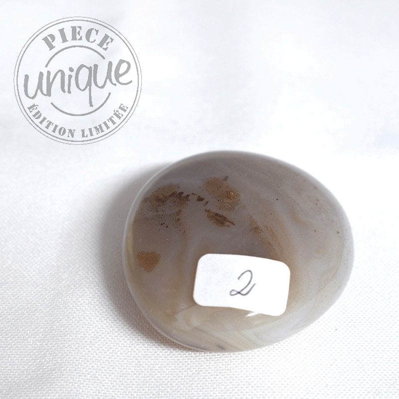 L'Agate est une variété de Calcédoine, dont la composition chimique est un dioxyde de silicium (SiO2) faisant partie de la famille des Quartz.