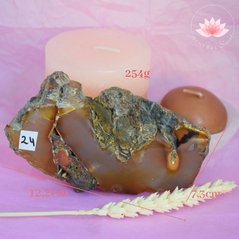 L'Agate est une variété de Calcédoine, dont la composition chimique est un dioxyde de silicium (SiO2) faisant partie de la famille des Quartz.