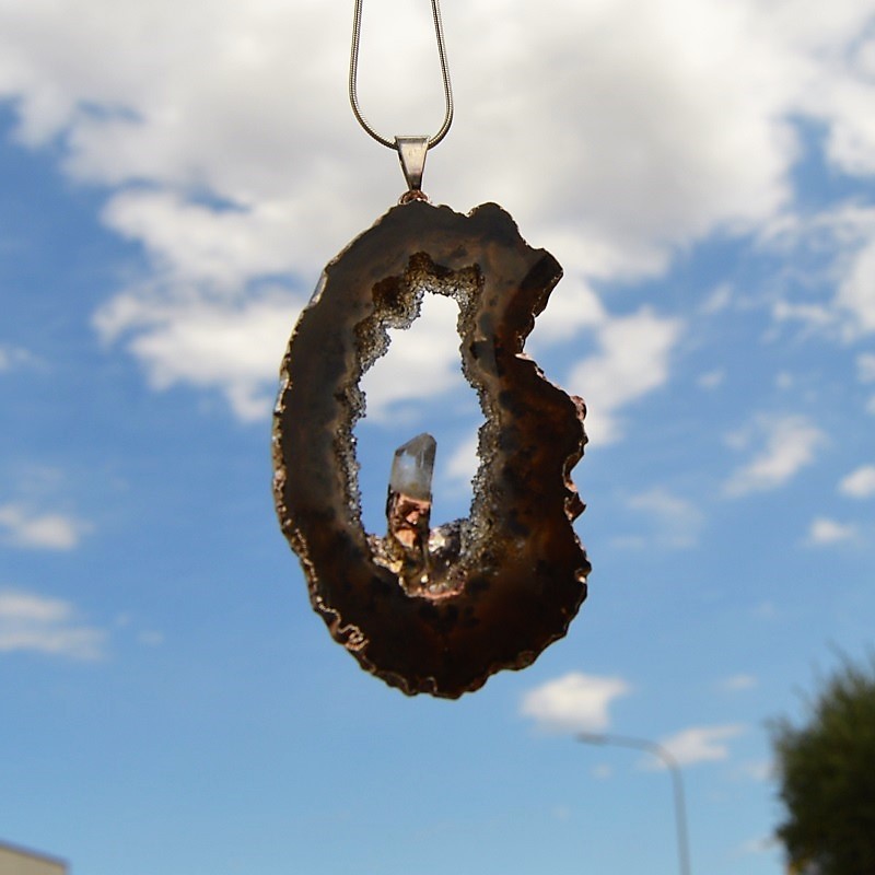 le cristal de roche intensifie l'énergie de l'agate et apporte de la lumière à ce pendentif.