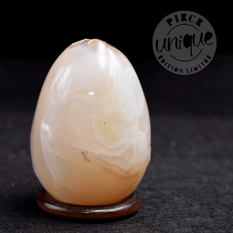 L'Agate est une variété de Calcédoine, dont la composition chimique est un dioxyde de silicium (SiO2) faisant partie de la famille des Quartz.