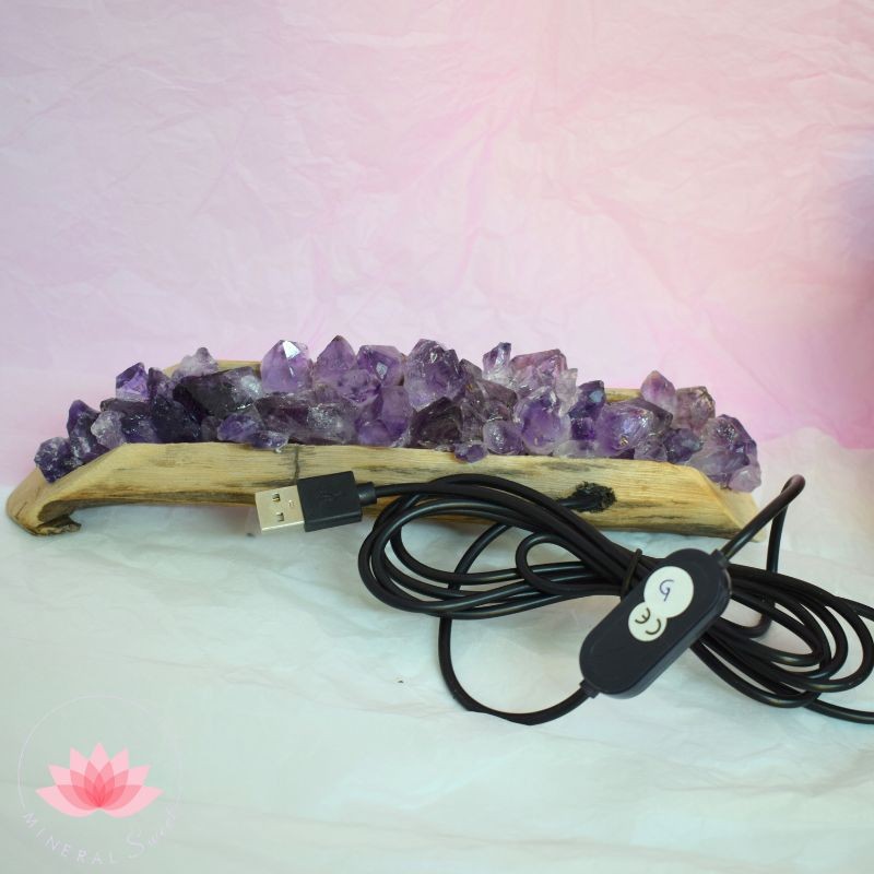Lampe avec une base de bois naturel et pointes naturelles d'Améthyste collées.