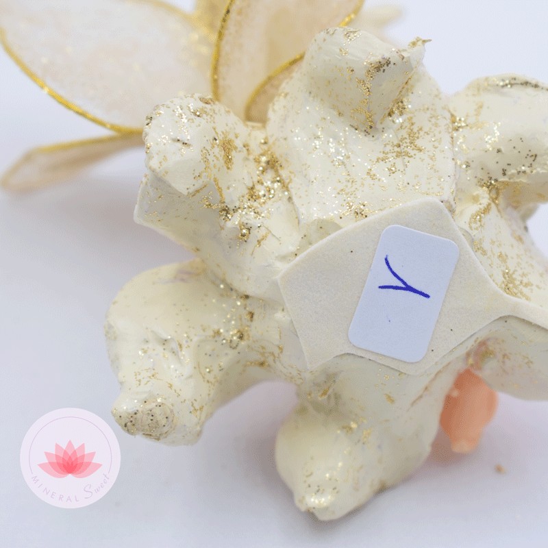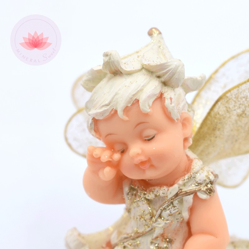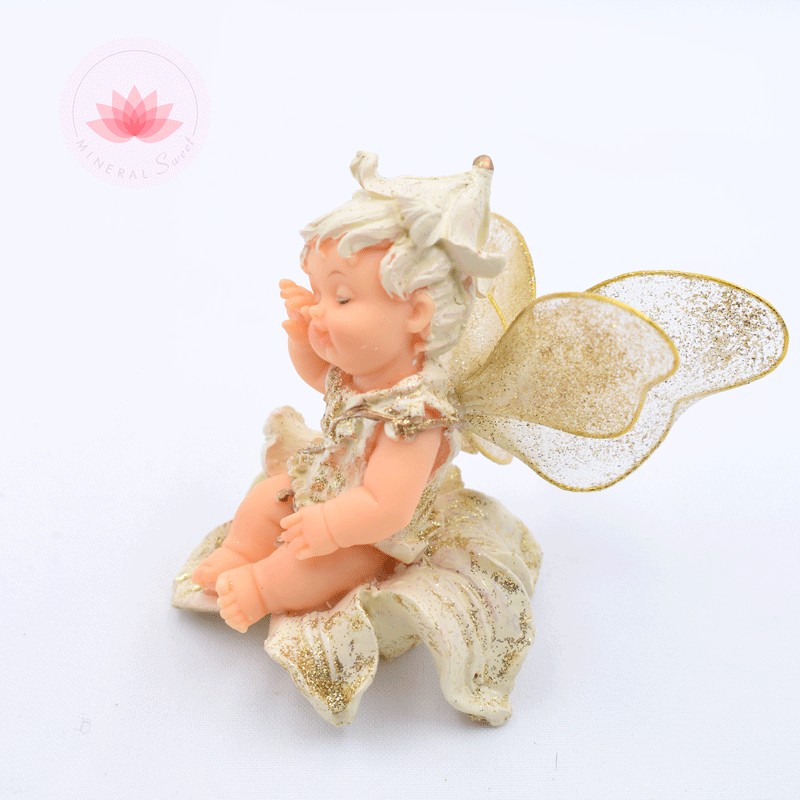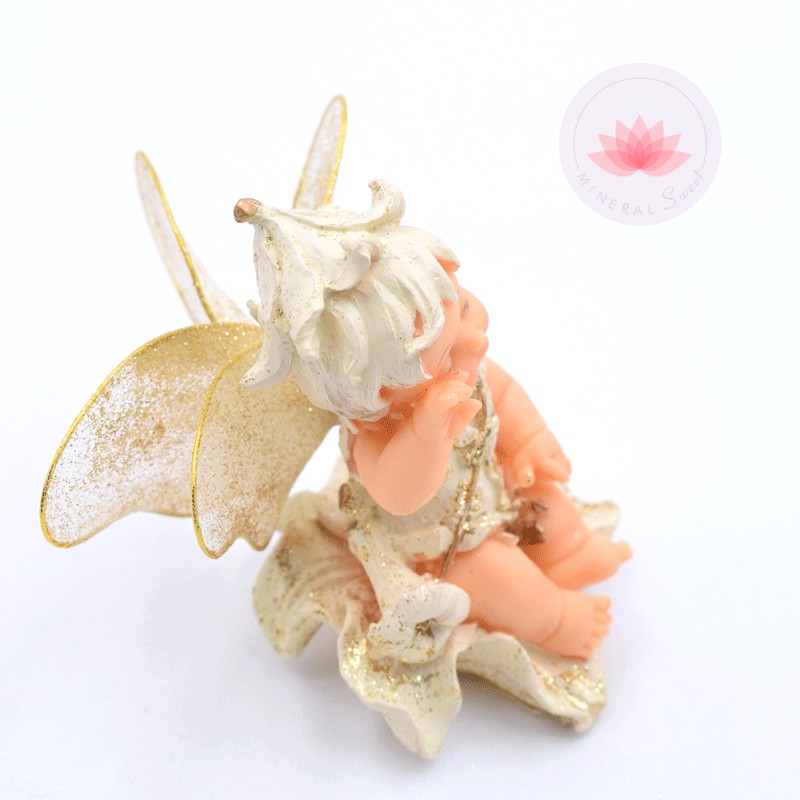 BEaux anges bébés en résine, sur une fleur et avec des ailes et des détails dorés.