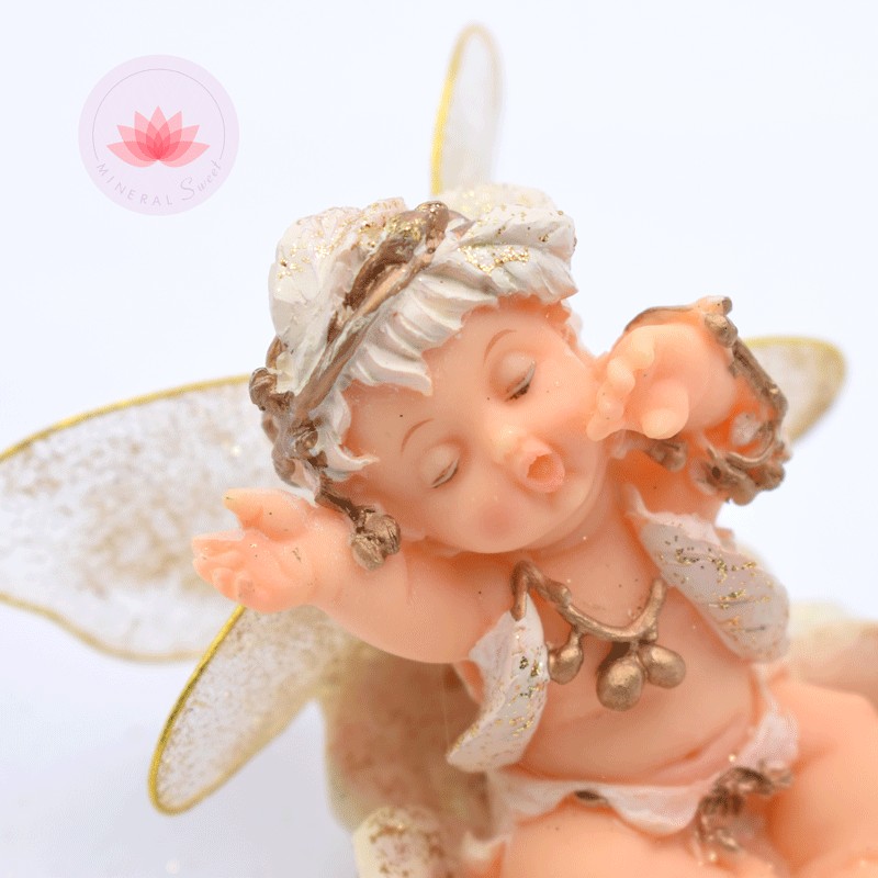 Beau ange bébé sur une fleur, avec des ailes et des détails dorés.