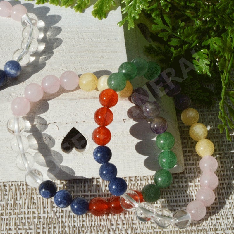Beau bracelet en pierres des 7 chakras: cristal de roche, sodalite, cornaline, aventurine, améthyste, calcite jaune et quartz rose.