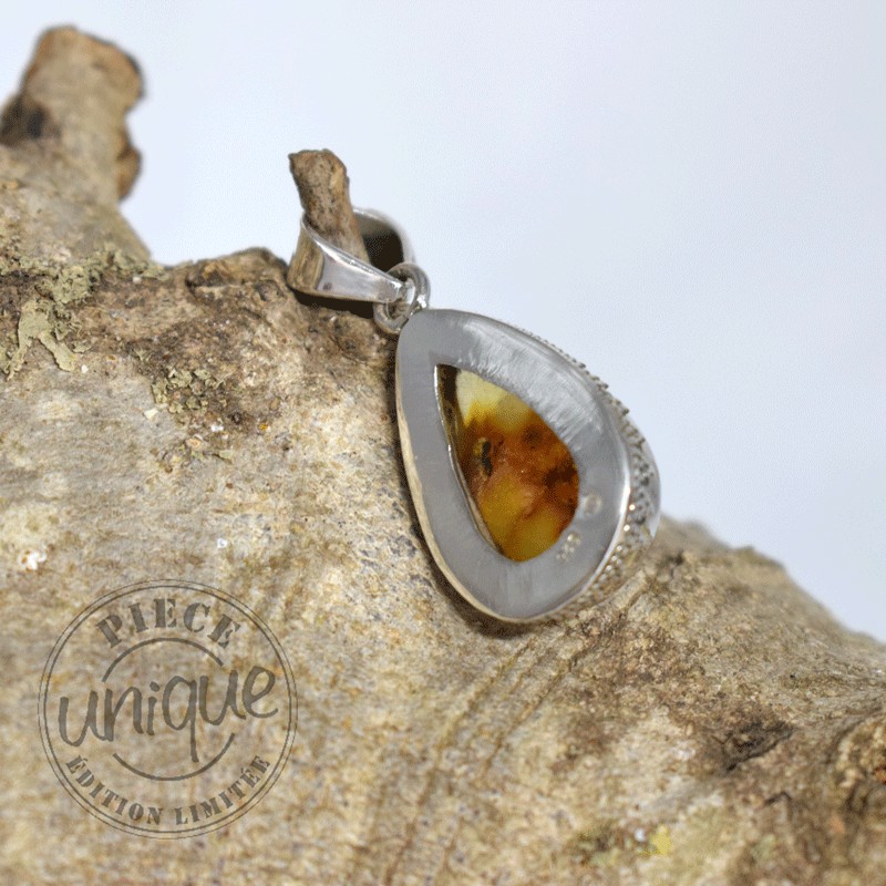 Pendentif en ambre naturel serti argent 925.