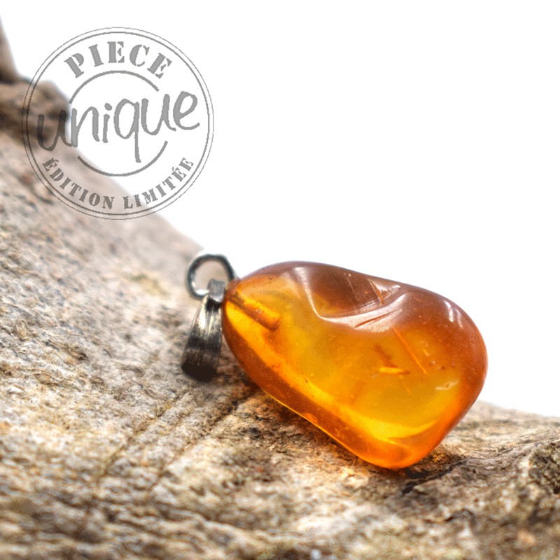 Pendentif en Ambre 100% naturel, avec une belière en métal vieilli et un cordon noir.