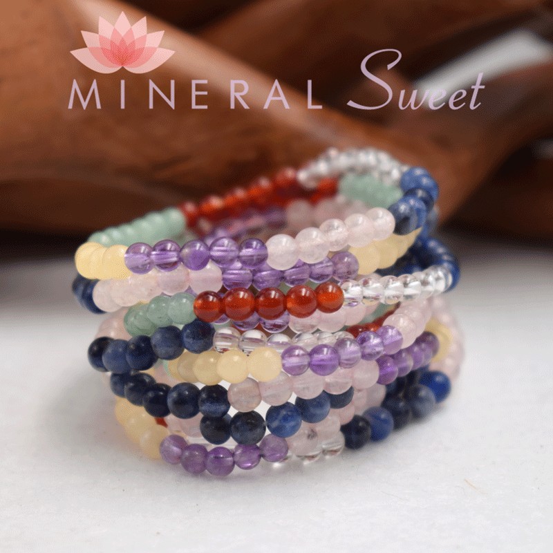 Bracelet en perles rondes, diamètre 4mm, composé d'Améthyste, Quartz rose, Cornaline, Calcite jaune, Aventurine, Cristal de roche, Sodalite.