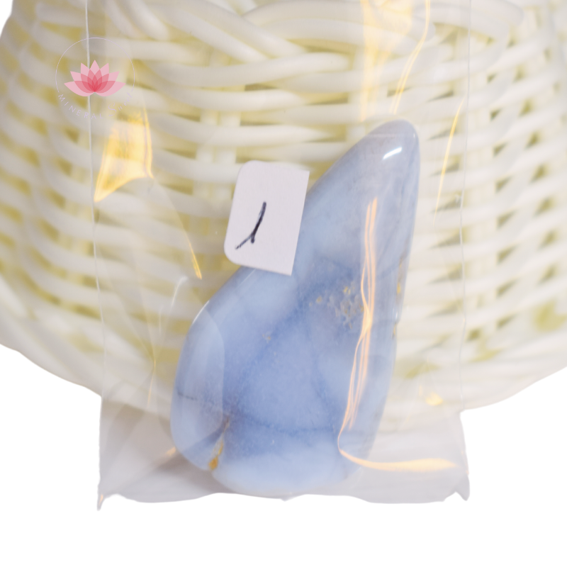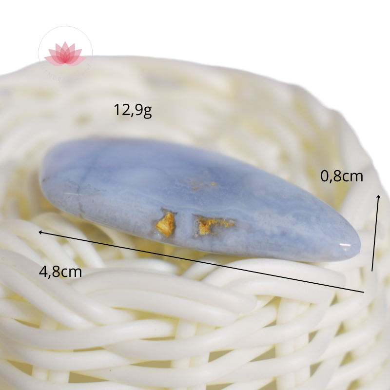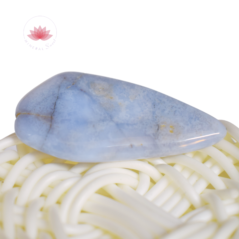 La calcédoine est un minéral composé de cristallites de quartz, dont la taille est comprise entre 50 et 100 nm3, agencées en fibres. Il s'agit d'une phase de la silice. sa formule est un dioxyde de Silicium, SiO2. Elle fait partie de la Famille des agates. Sa couleur peut être Bleu, gris laiteux bleuté, mauve pâle.