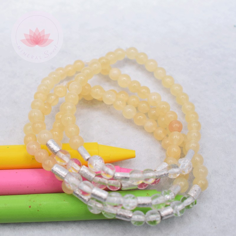 Bracelet pour fille en calcite jaune, cristal de roche et cylindres en métal argenté. Perles 4mm