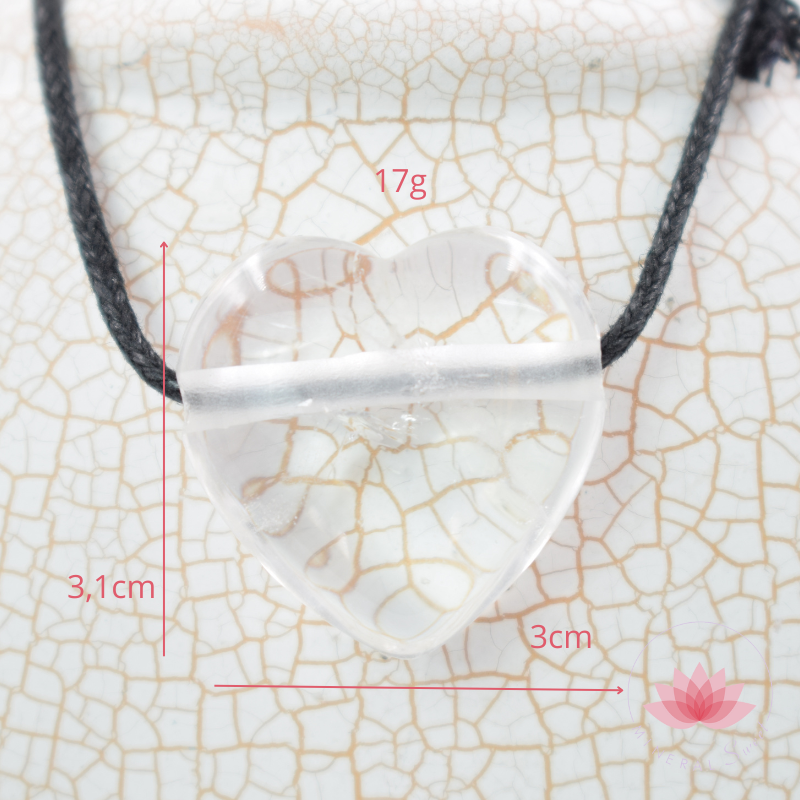 Pendentif de Cristal de roche en forme de coeur, avec un cordon noir.