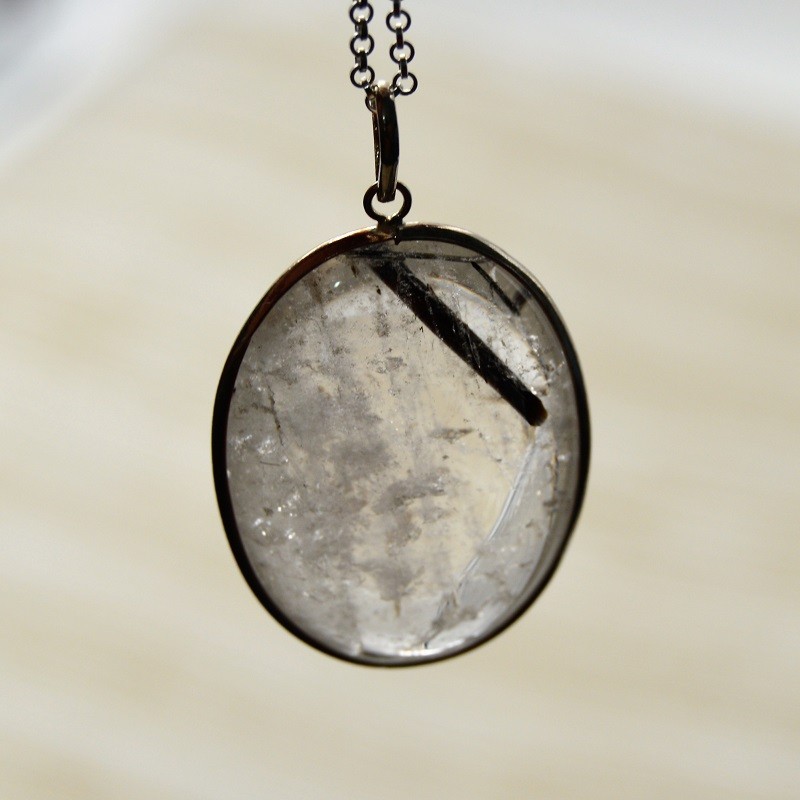 Pendentif oval Cristal de Roche inclusion tourmaline noire et argent