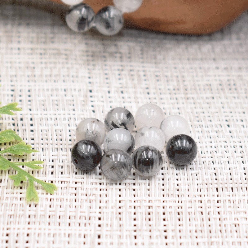 Nous vous proposons des perles rondes de Cristal de roche avec inclusion de Tourmaline noire naturelles à l'unité, diamètre 8mm.