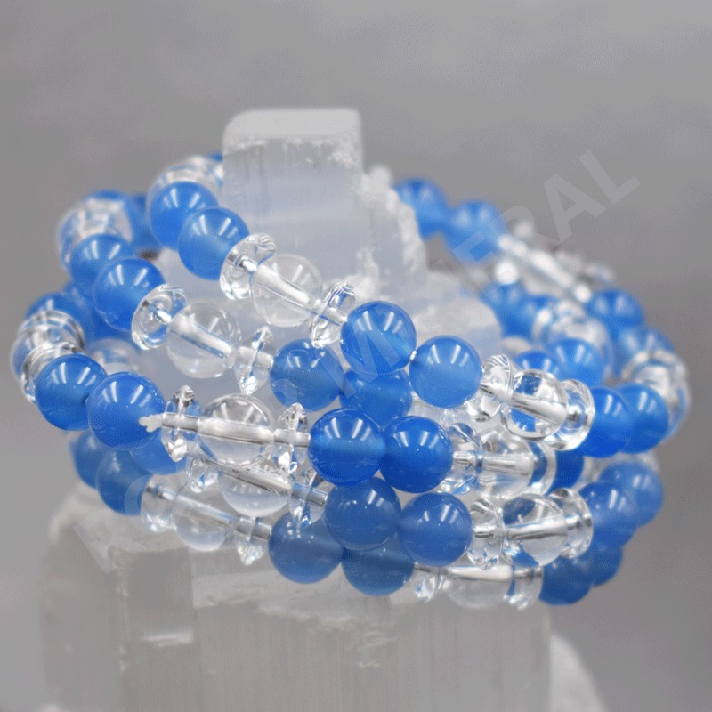 Élégant bracelet en Cristal de roche et Quartz teinté bleu.