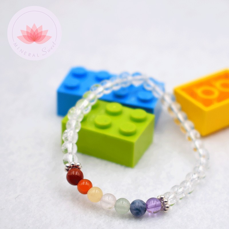 Bracelet pour fille en Cristal de roche, perles du 7 chakras et perles métalliques.