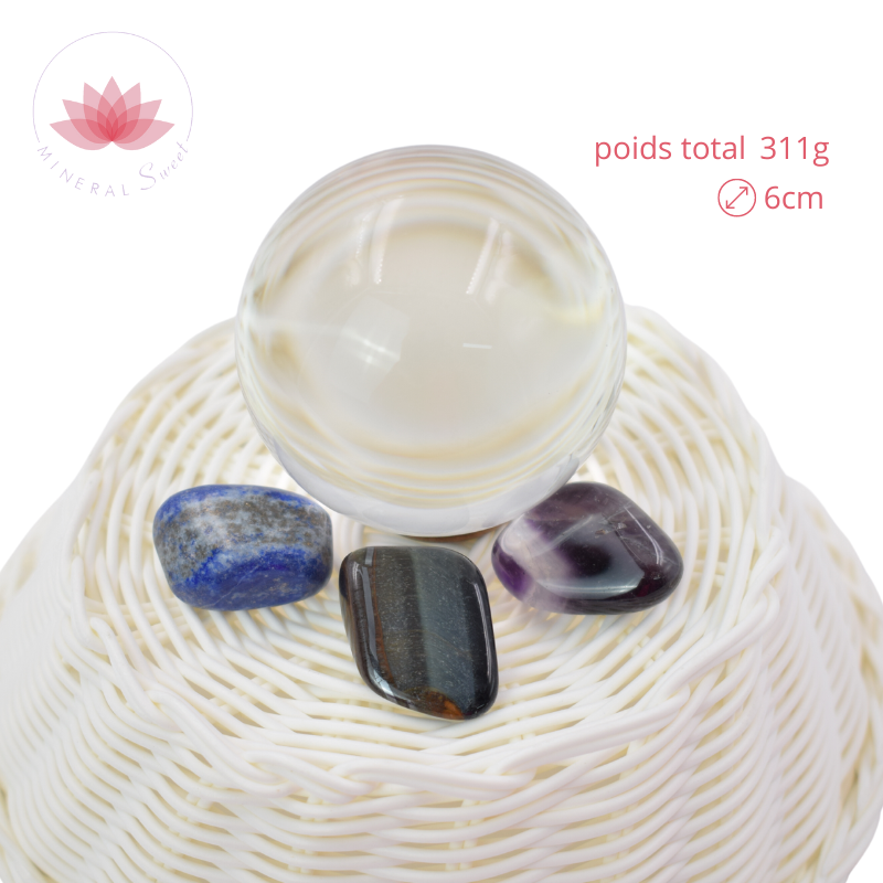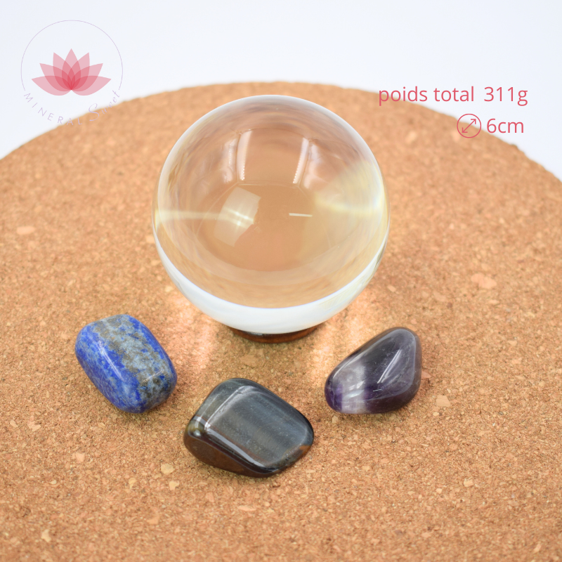 1 boule cristal de verre de 6cm de diamètre entourée de 3 pierres : un Lapis Lazuli, un Oeil de Faucon, une Améthyste.