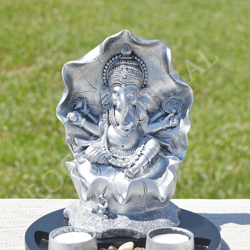 Dieu Ganesh en résine, couleur argent, avec support et deux porte-bougies.