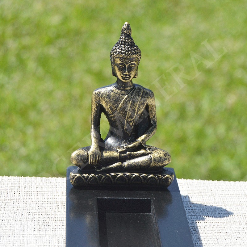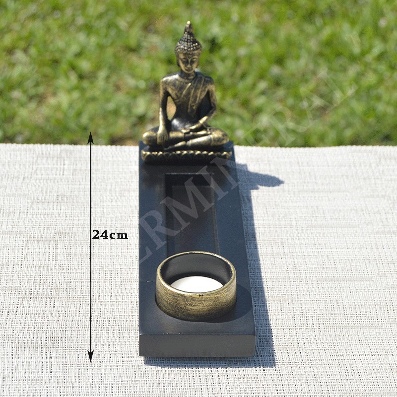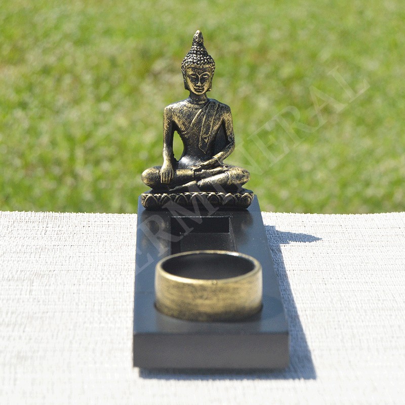 Bouddha doré en résine sur son support avec porte bougie, porte encens.