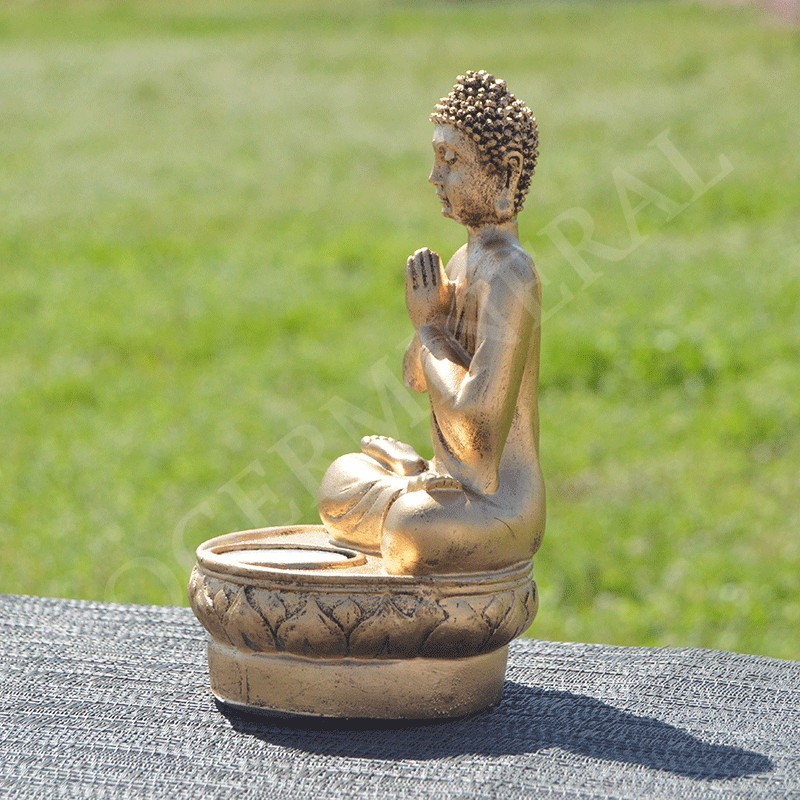 Statue de Bouddha en prière, les mains jointes, en méditation, pour nous inviter à nous concentrer sue nos souhaits et à les méditer pour leur apporter toute l'énergie nécessaire à leur réalisation