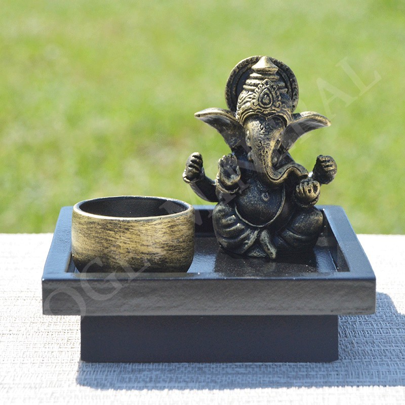 Petit jardin zen composé de Ganesh en résine sur un support avec un porte bougie, pour apporter un brin de sérénité à nos ambiances.